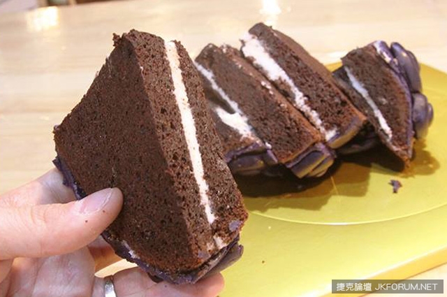 切開後,橡膠果實裡面是巧克力蛋糕搭配鮮奶油。