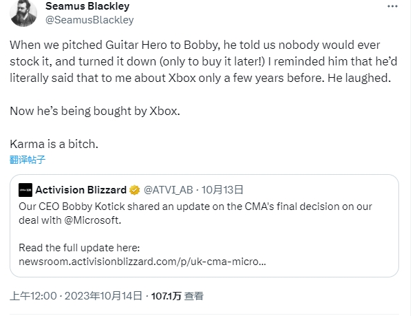 蜗牛电竞10月14日讯 近日初代 Xbox 联合创始人 Seamus Blackley 更推发文臭骂考迪克,称以前向他推销《吉他英雄》(演示 Demo),考迪克拒绝并告诉他没有人会购买这款游戏,后来动视还是付了钱。