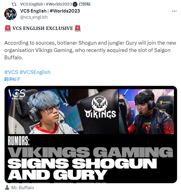 今日该媒体再次爆料称,前西贡水牛打野与adc将加入sofm的Viking Gaming。