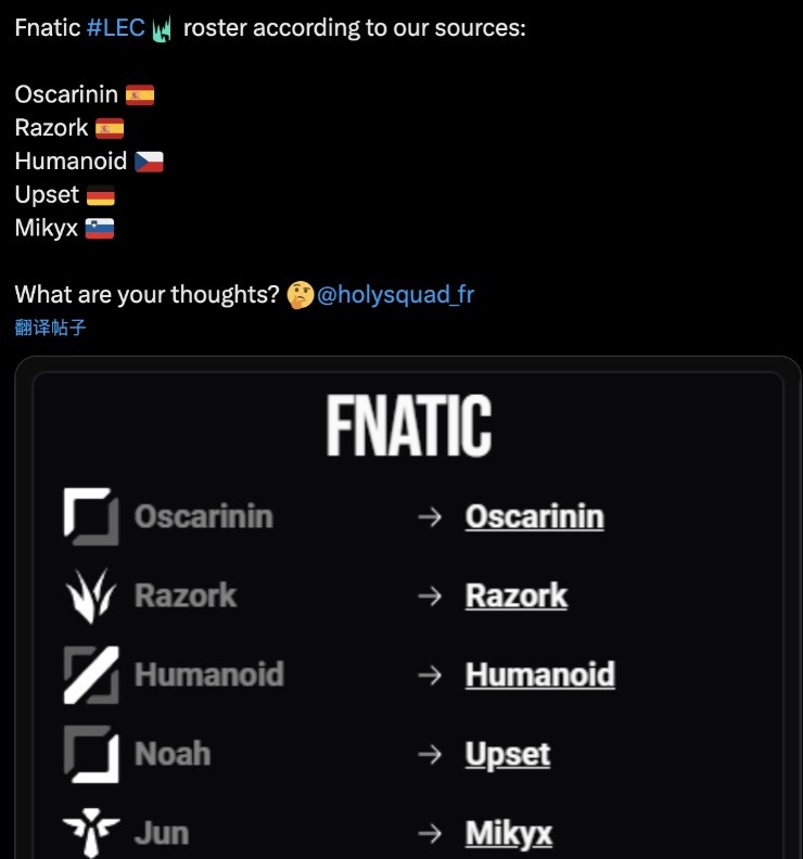 蜗牛电竞11月6日讯 外媒Sheep Esports爆料FNC战队下赛季阵容,仅更换了下路,Upset回归!