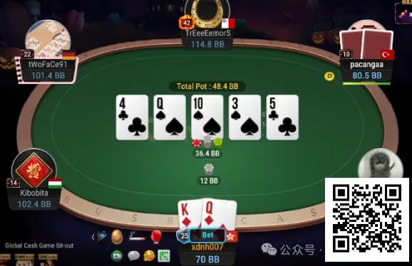 很多人看到这张5就会担心54和55,或者担心对方慢打flush,觉得bet出去被推很难受,于是就选择比较舒服的check call。