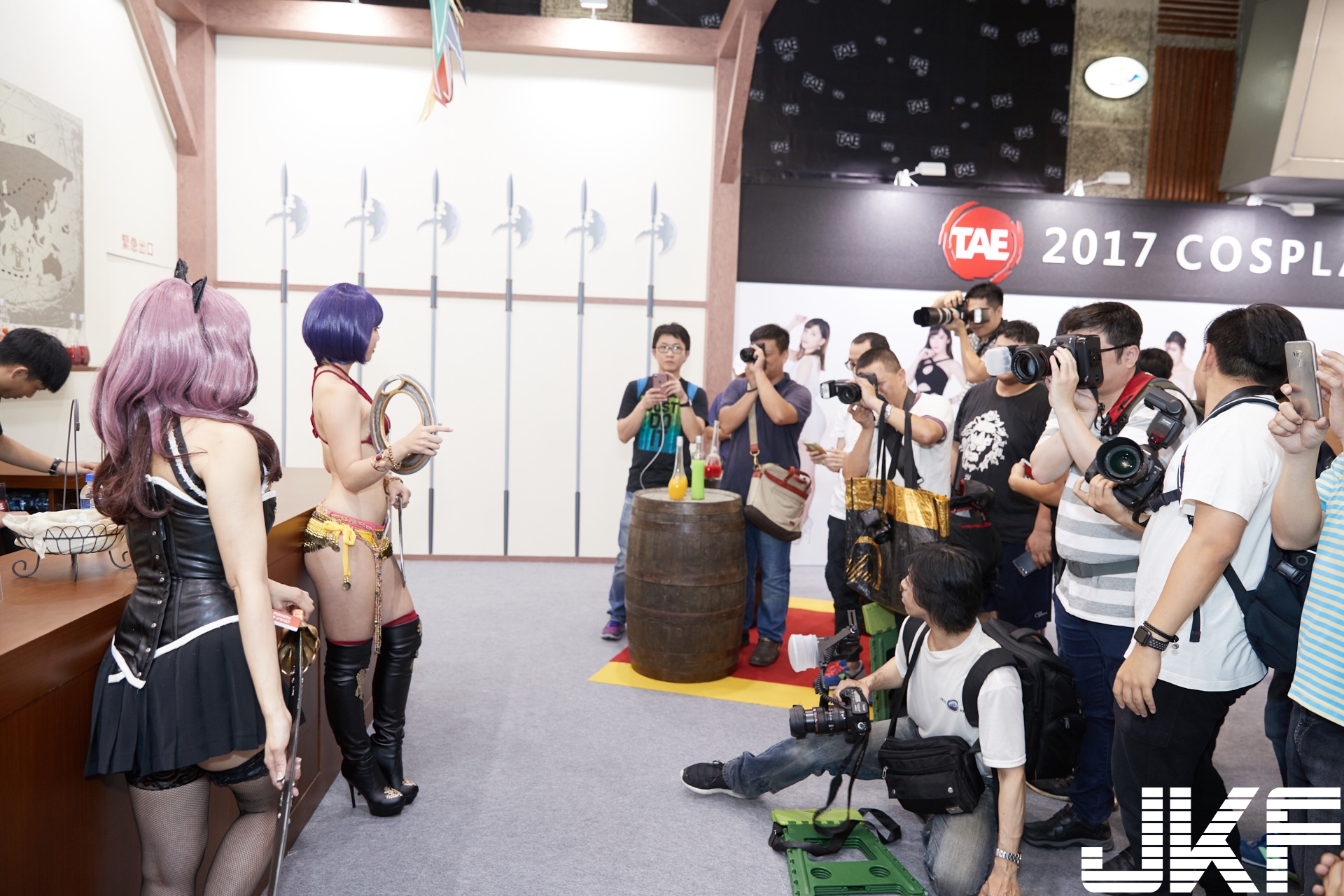 一進到TAE展場,拿了超可愛日本妹給的紀念品後,走向右手邊的方向,常常擠得水洩不通,納悶明明這裡的SG和別的地方比起來算穿得多,但還是超多鎂光燈閃閃閃,就是裝潢超特別的TAE COSPLAY區!